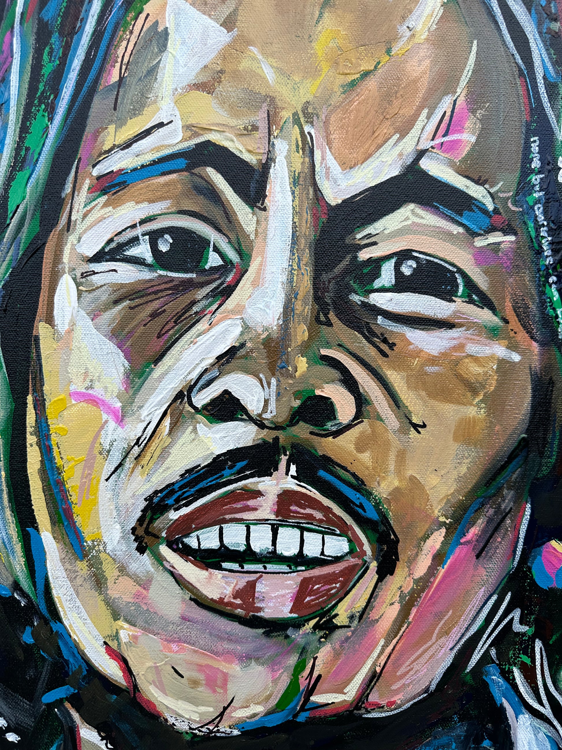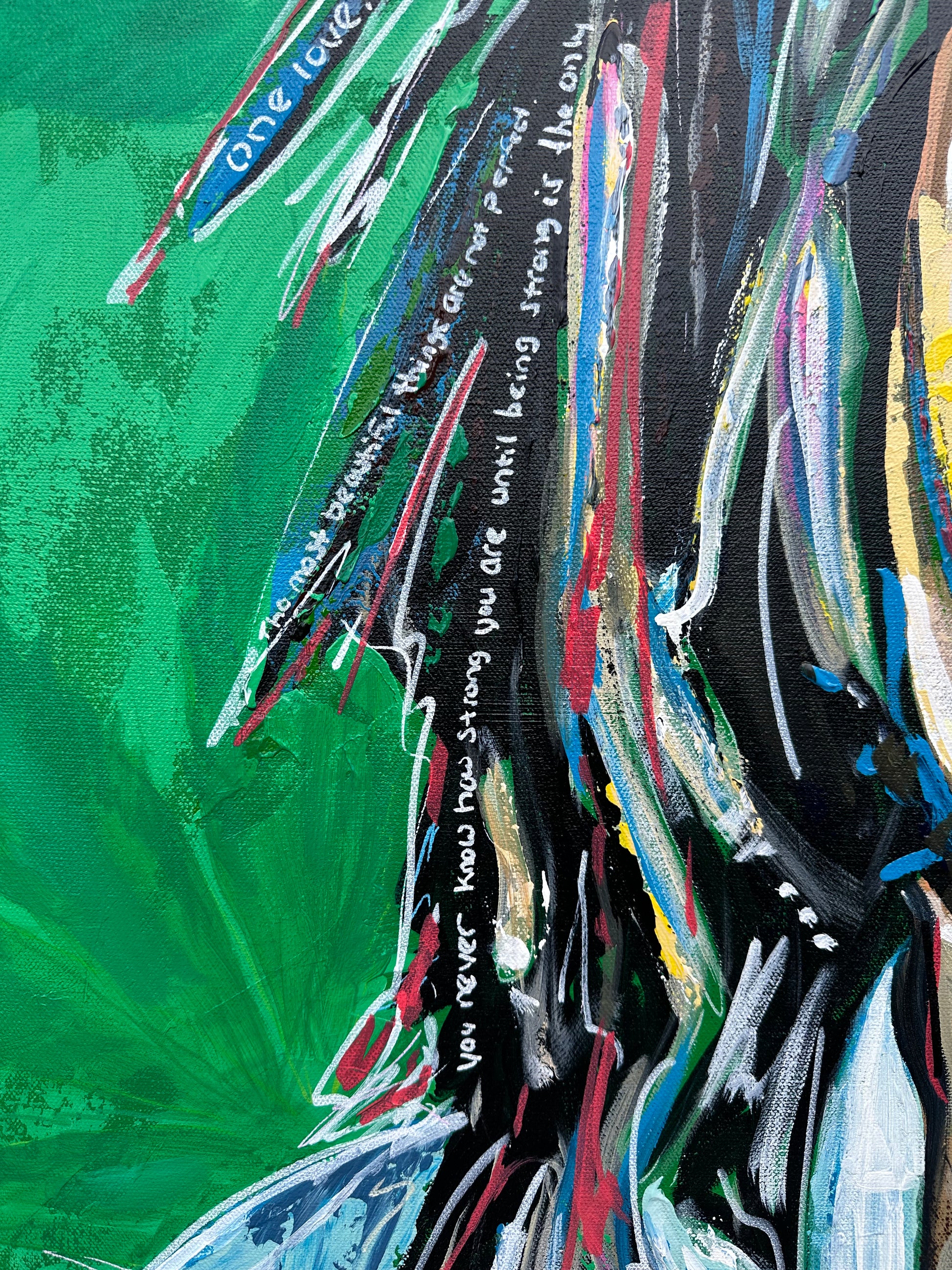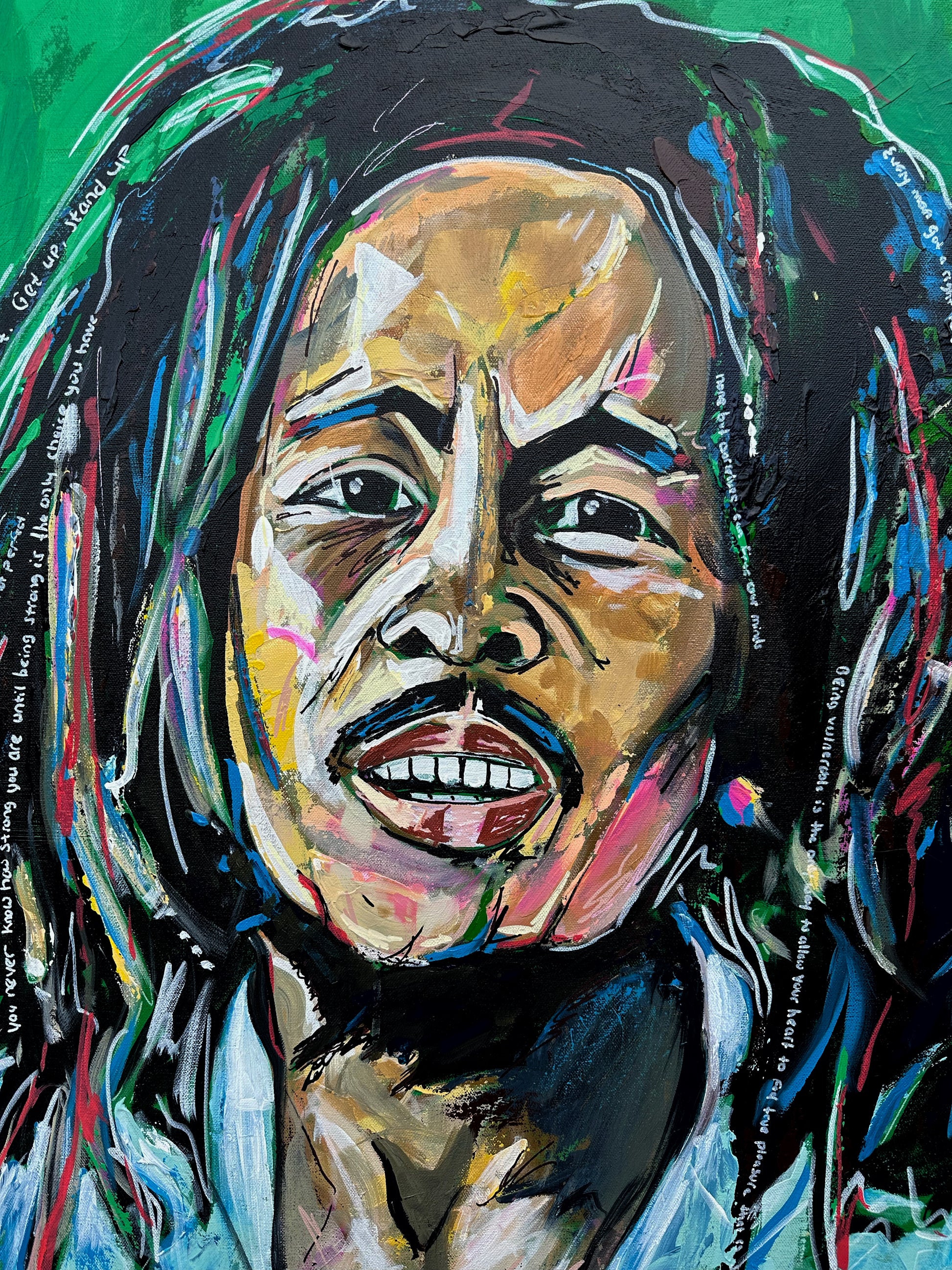 "One Love" is a 36" x 36" mixed media painting inspired by the legendary Bob Marley. This painting isn’t meant to be polished—it’s meant to feel alive. Bob stood for truth, freedom, and unapologetic authenticity, and I wanted this piece to carry that same energy. The layered textures and expressive colors represent the depth of his influence and the way his message still moves through generations, cultures, and moments of struggle.